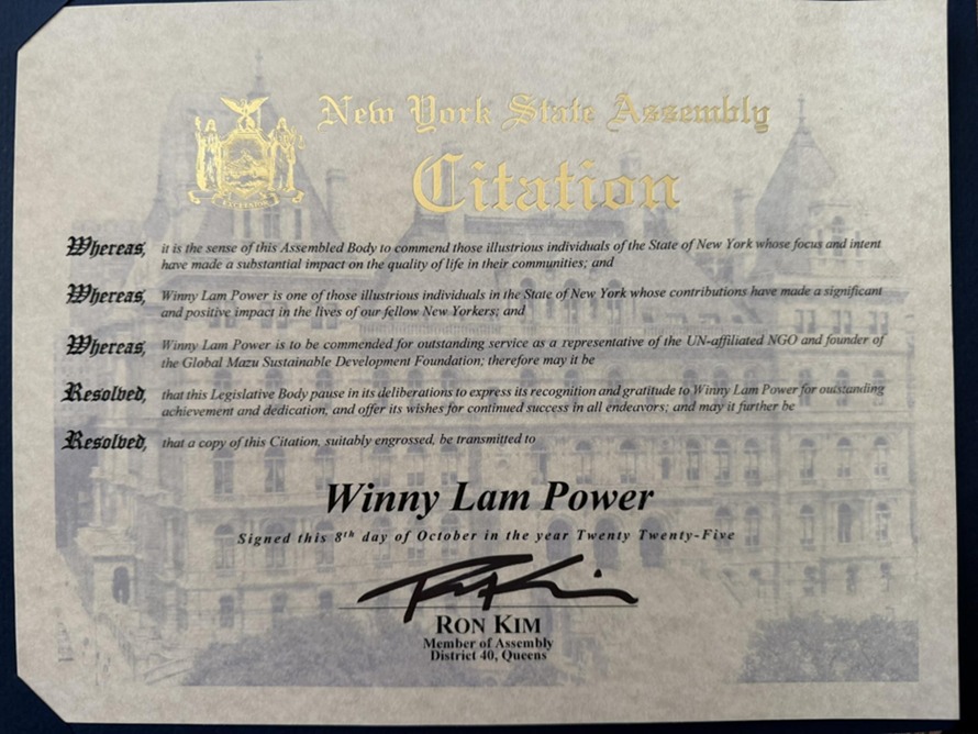 The citation was presented by New York State Assembly Member Ron Kim, recognizing Ms. Power’s exemplary achievements in promoting cultural understanding, social inclusion, and cross-cultural dialogue as a UN NGO representative and cultural ambassador of Mazu traditions. Assemblyman Kim remarked: “Ms. Winny Power is not only a promoter of Chinese traditional culture but also a bridge between civilizations. Through her actions, she embodies the spirit of loyalty and compassion, serving as a role model for New York’s multicultural community.”