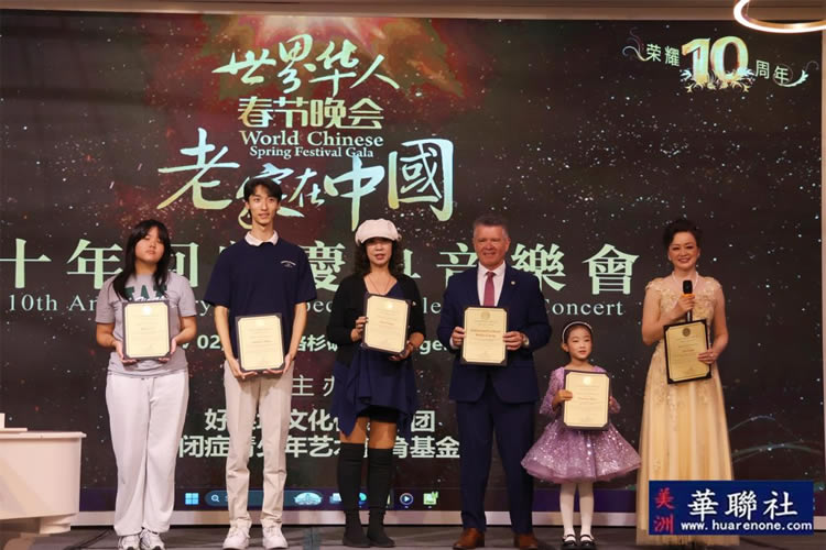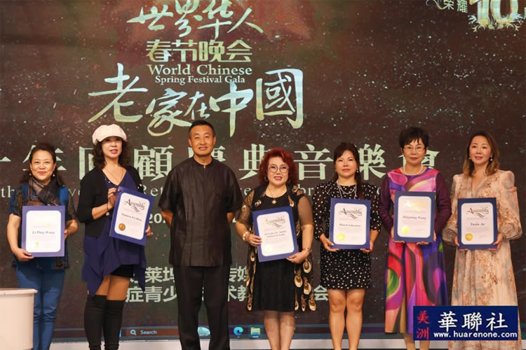 美国南加州华人社团联合会荣誉主席、美中和平友好促进会会长鹿强先生,代表加州众议员方树强为长期支持“老家在中国”春晚的艺术家与机构颁发荣誉证书。