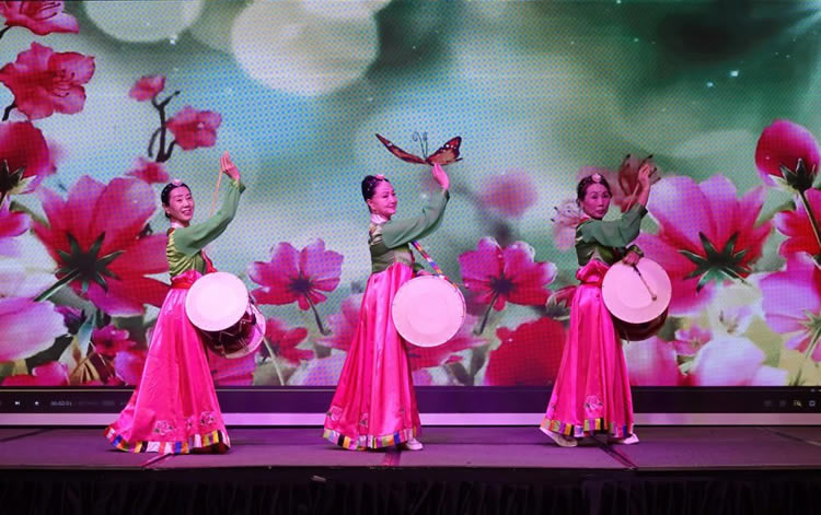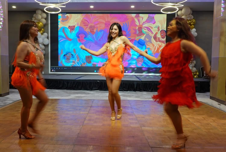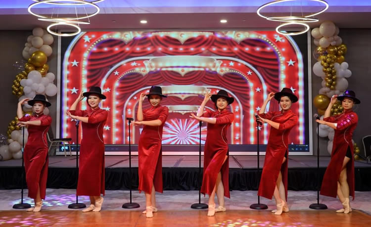 庆典进入艺术表演环节,节目形式丰富多元,涵盖音乐、舞蹈、声乐与国际经典曲目,充分展示中外文化交融的魅力。来自星星的“钢琴王子”段博文以一曲《彩云追月》奏出梦回故里的柔情;Jean Gao Dance Arts Center带来活力四射的《韩舞串烧》和古韵悠长的《绝代风华》,让青春与东方之美交相辉映;来自保加利亚歌剧院首席女高音歌唱家Mariana Popzlateva深情演绎《我爱你,中国》,唱出了亿万游子共同的心声;Eleanor Ren以钢琴独奏《肖邦升C小调圆舞曲》带来浪漫的欧洲风情;Phoebe Chen与陈和霞老师合作的《在水一方》如梦似水;雅利舞蹈学校的双人舞《无声的对白》以肢体语言诠释灵魂的共鸣;David Ren与主持人Qiu合唱的《如愿》,声声动人,将庆典推向了高潮;花样年华女团献唱《喀秋莎》,重现时代旋律;王晶的《军营飞来一只百灵鸟》、Lauren Acosta老师带领的熔岩玫瑰拉丁舞团,表演了激情澎湃的桑巴舞蹈: 幸福桑巴。杨紫萍的《天时地利人和》、Hart Chen演唱莫扎特歌剧《魔笛》选段《多么美丽的肖像》,展现了中西文化的交融之美。