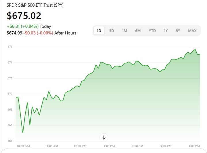 标普500对应的ETF SPY 收于 675.02,上涨 0.94%