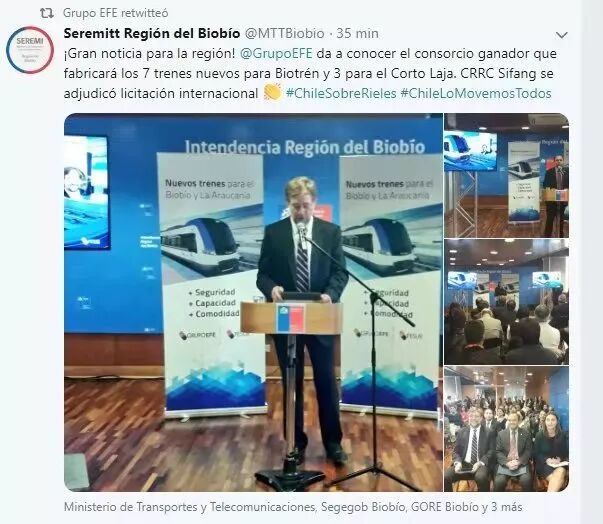 在当地时间10月26日举行的发布会上,智利交通部副部长Jose Luis Dominguez宣布:在分析三大国际铁路厂家的技术和经济的竞价后,智利国家铁路公司(EFE)董事会决定授予中国企业——中车四方股份公司列车制造合同。