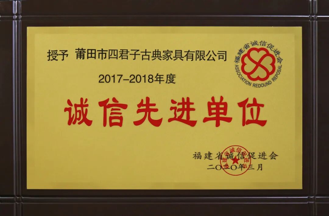 日前,四君子古典家具被授予福建省第六届“诚信先进单位”荣誉称号,这是福建省推动诚信建设成立诚信促进会以来,古典家具企业首次登榜。诚信促进会名誉会长:中共中央书记处书记、中央统战部部长、福建省委前书记尤权,会长为福建省第十二届人大常委会副主任陈伦。