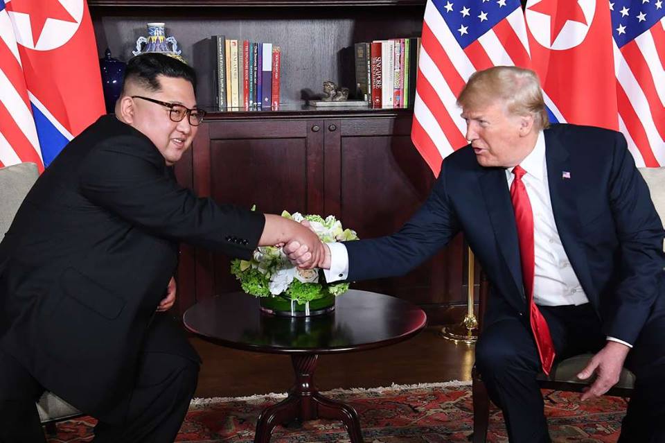 朝鲜最高领导人金正恩与美国总统特朗普在新加坡嘉佩乐酒店会晤现场。