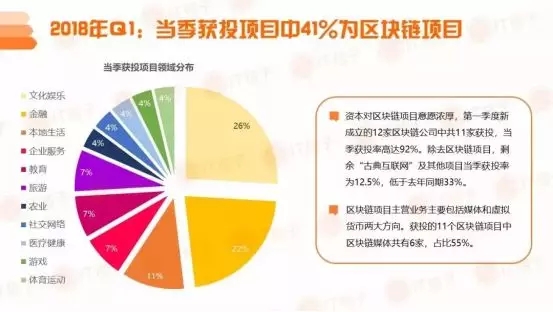 据IT桔子数据显示,今年第一季度获得风险投资的项目中41%为区块链项目,主要业务包括媒体和虚拟货币两大方向。